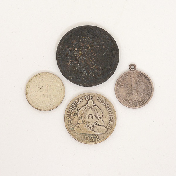• NUMISMÁTICA, Estrangeira, quatro (4) moedas em PRATA: 5 francos franceses de 1960; 1/2 franco Suíço de1957; 10 cents de dólar de 1941 (com argola soldada na serrilha); 50 centavos de Honduras de 1932, todas circuladas,peso total aproximado 23 gr.
