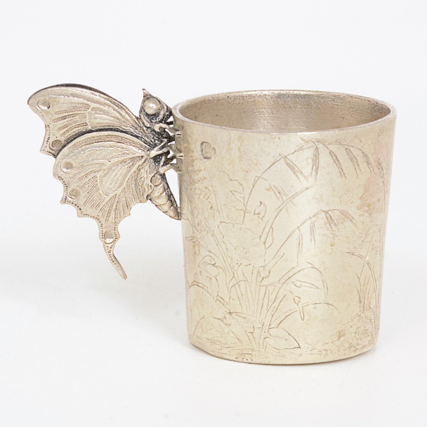 • PRATA FRANCESA, um (1) copinho ligeiramente obcônico, burilado em elementos vegetalistas, alça relevada emborboleta, punções: Cabeça de Minerva e marca do ourives parcialmente legível, possivelmente François Nicoud, Ativoem Paris no século XIX, medindo 4 cm altura, peso aproximado 43 gr., sinais de uso, vide foto.