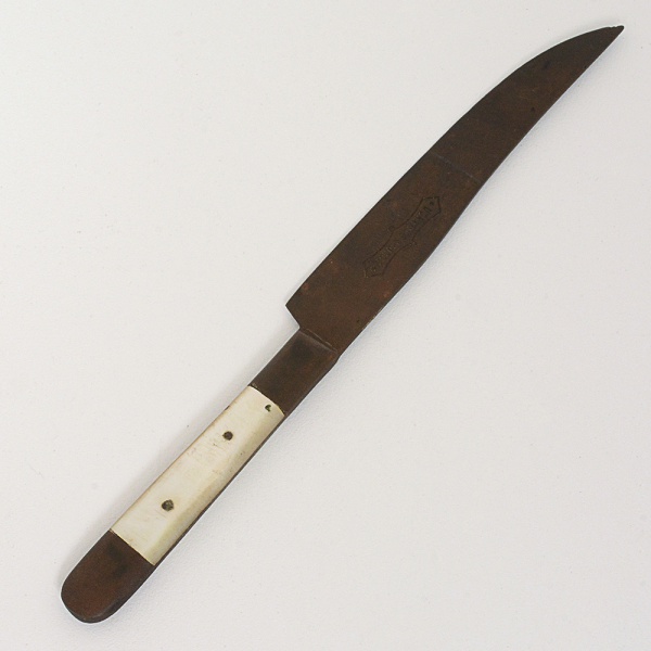 • CUTELARIA, uma (1) faca com lâmina marcada UCHATIUS BRONCE, origem alemã ou austríaca, empunhaduracom aplique em madrepérola, medindo 14 cm comprimento, sinais de uso, vide foto.
