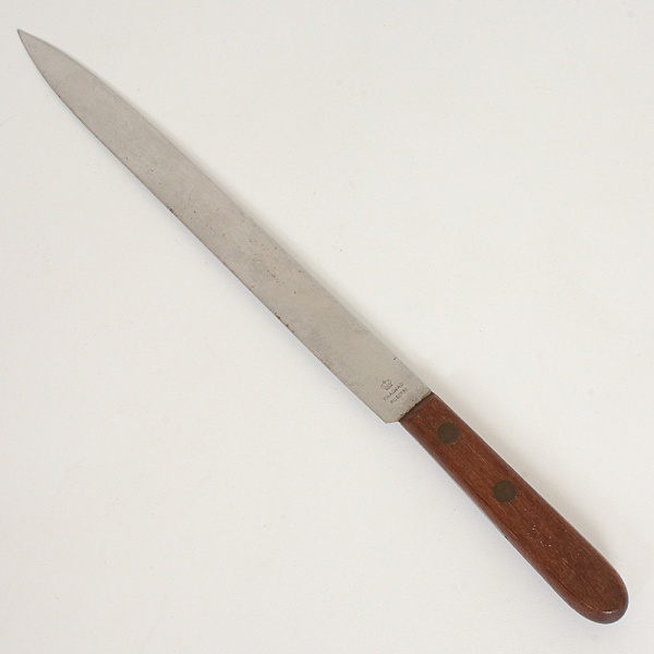• CUTELARIA, uma (1) faca longa para lida, lâmina em aço inox (RUSTFRI), marca RAADVAD (Copenhague,Dinamarca), empunhadura em madeira, medindo 37 cm comprimento, sinais de uso, vide foto.