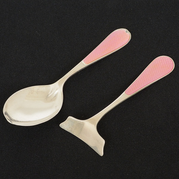 • PRATA INGLESA, dois (2) talheres para criança: 1 colher e 1 pá para empurrar a comida, cabos com esmaltação natonalidade rosa, com os seguintes punções: HCD (ourives Henry Clifford Davis, registrado em Birmingham no ano de1901); âncora (contrastaria de Birmingham); Leão Passante (garantia do teor da prata 925 milésimos  sterling); letra Z(ano de fabricação 1924), medindo a maior 11 cm comprimento, peso total 33 gr, pequenas falhas na esmaltação, sinaisde uso, vide foto.