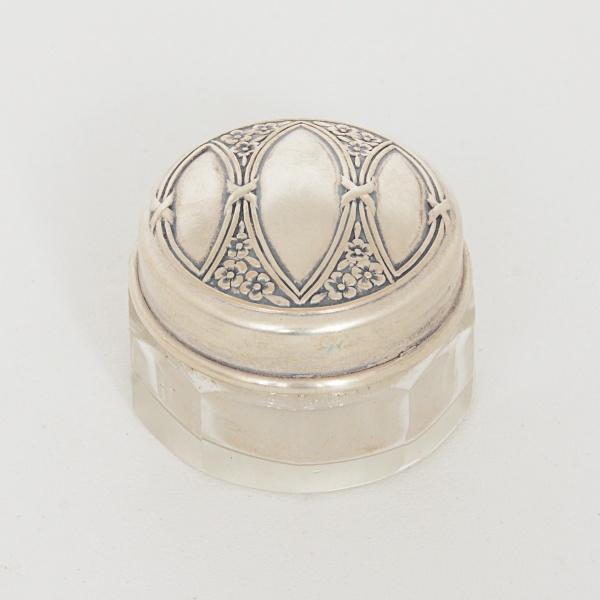 • VIDRO E PRATA ALEMÃ, um (1) pequeno pote, facetado, incolor e translúcido, tampa com ornamentaçãorelevada em flores e frisos intercalados por X, com os seguintes punções: Coroa e a Lua (marca nacional que substituiuas marcas individuais das cidades, Lei Federal de 16 de Julho 1884, usada a partir de 1886, tornou-se obrigatória em 1Janeiro de 1888); HB (Hermann Behrnd, fundada no ano de 1881 em Dresden, Alemanha), 800 (teor da prata emmilésimos), medindo 3 cm diâmetro e 2 cm altura, peso somente da tampa em prata 3,1 gr., sinais de uso, vide foto.