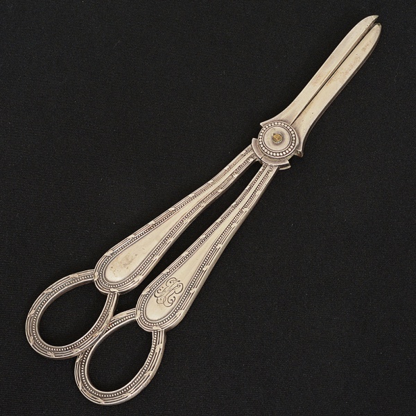 • METAL PRATEADO, uma (1) tesoura de mourão, ornamentação relevada em frisos e perolados, marca possessóriamonogramada, pertenceu ao GRAND HOTEL GUARUJA, manufatura MAPPIN & WEBB, medindo 18,5 cmcomprimento, sinais de uso, vide foto.