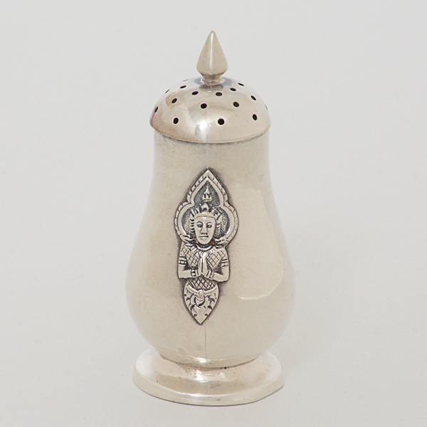 • PRATA, um (1) polvilhador com ornamentação figurativa relevada representando BUDDHA (popularmenteconhecido como SIDDHARTHA GAUTAMA, foi um príncipe de uma região no sul do atual Nepal que, tendorenunciado ao trono, se dedicou à busca da erradicação das causas do sofrimento humano e de todos os seres, e destaforma encontrou um caminho até ao despertar ou iluminação), encimado por cone, pé baixo, tampa rosqueável, mossasna base, puncionado MADE N SIAM STERLING, medindo 6 cm altura, peso aproximado 21 gr., sinais de uso, videfoto.