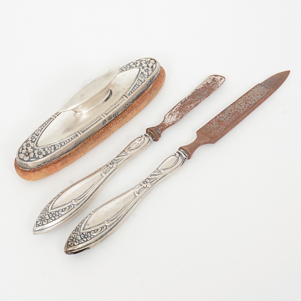 • ACESSÓRIOS FEMININOS EM PRATA, três (3) itens antigos para manicure, cabos relevados em flores,puncionados: 800 (teor da prata em milésimos); Coroa e a Lua (marca nacional que substituiu as marcas individuais dascidades, Lei Federal de 16 de Julho 1884, usada a partir de 1886, tornou-se obrigatória em 1 Janeiro de 1888) e marcade ourives HB (Hermann Behrnd, fundada no ano de 1881 em Dresden, Alemanha), medindo a maior peça13 cmcomprimento, peso total 37 gr., sinais de uso e oxidação, vide foto.