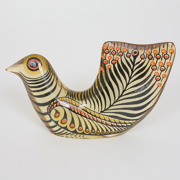 • PALATNIK, uma (1) escultura representando pomba, (Abraham Palatnik, Natal, Rio Grande do Norte, 1928, artistacinético, pintor e desenhista; em 1932, muda-se com a família para a região onde, atualmente, se localiza o Estado deIsrael; de 1942 a 1945, estuda na Escola Técnica Montefiori em Tel Aviv e se especializa em motores de explosão einicia seus estudos de arte no ateliê do pintor Haaron Avni; do escultor Sternshus e estuda estética com Shor; freqüenta oInstituto Municipal de Arte de Tel Aviv, entre 1943 e 1947; retorna ao Brasil em 1948, e se instala no Rio de Janeiro.Convive com os artistas Ivan Serpa, Renina Katz e Almir Mavignier, com este último frequenta a casa do crítico de arteMário Pedrosa e conhece o trabalho da doutora Nise da Silveira, no Hospital Psiquiátrico do Engenho de Dentro; Ocontato com os artistas e as discussões conceituais com Mário Pedrosa fazem Palatnik romper com os critériosconvencionais de composição, abandonar o pincel e o figurativo e partir para relações mais livres entre forma e cor. Porvolta de 1949, inicia estudos no campo da luz e do movimento, que resultam no Aparelho Cinecromático, exposto em1951 na 1a Bienal Internacional de São Paulo, onde recebe menção honrosa do júri internacional; em 1954, integra oGrupo Frente, ao lado de Ivan Serpa, Ferreira Gullar, Mário Pedrosa, Franz Weissmann, Lygia Clark e outros;desenvolve a partir de 1964 os Objetos Cinéticos, um desdobramento dos cinecromáticos, mostrando o mecanismointerno de funcionamento e suprimindo a projeção de luz. O rigor matemático é uma constante em sua obra, atuandocomo importante recurso de ordenação do espaço. É considerado internacionalmente um dos pioneiros da arte cinética),confeccionada em resina de poliéster em policromia, medindo 16,5 cm comprimento, vide foto.