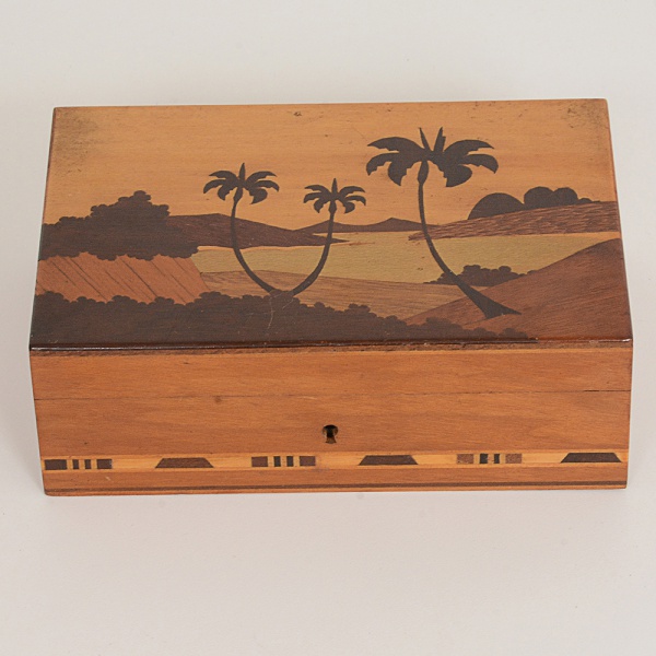 • DIVERSOS, uma (1) antiga caixa com tampa marchetada representando paisagem do Rio de Janeiro, madeirasdiversas, lateral geometrizada, traz selo parcial da Indústria São Bento do Sul, abertura basculante, dobradiça e fecho emmetal, falta a chave, medindo 18 x 12 x 6 cm, sinais de uso, vide foto.