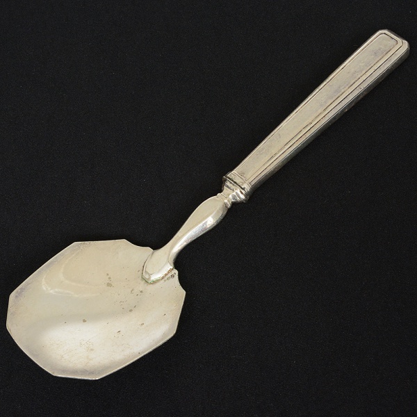 • METAL PRATEADO, uma (1) antiga colher de servir, punção parcial de manufatura francesa, cabo ornado comfrisos, concavidade da concha octogonal, medindo 20 cm comprimento, sinais de uso, vide foto.