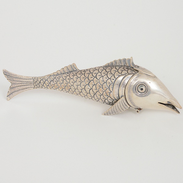 • PRATA BRASILEIRA, um (1) antigo paliteiro no formato de peixe, puncionado CORRÊA 833, medindo 15 cmcomprimento, olhos de vidro, peso 54 gr., sinais de uso, vide foto.