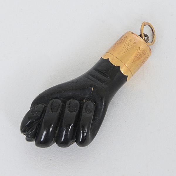 • OURIVESARIA BAIANA, um (1) antigo pingente representando figa do tipo tradicional, segundo o nossosincretismo religioso, baseado no catolicismo herdado dos nossos avós portugueses misturado com os mistérios, cismase crendices, trazidas no bojo dos navios negreiros, simboliza a reprodução e anula as influencias negativas, entalhadaem azeviche, encastoada em OURO, medindo 4 cm comprimento, peso total 5,3 gr., sinais de uso, vide foto.