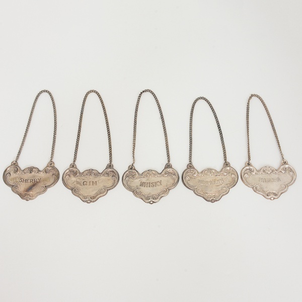 • METAL PRATEADO, cinco (5) identificadores para garrafa de bebida, com as legendas: GIN; VERMOUTH;SHERRY; WHISKY; MADEIRA, relevados em volutas e elementos vegetalistas, medindo 7 x 4,5 cm mais a corrente,todos com sinais de uso, vide foto.