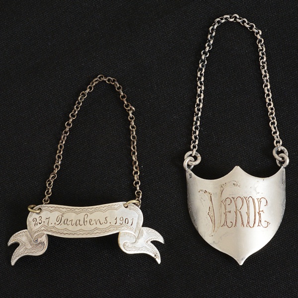 • METAL PRATEADO, dois (2) identificadores distintos para garrafa de bebida: 1 com a legenda VERDE; 1comemorando aniversário, datado de 23/7/1901 e a legenda PARABÉNS, medindo respectivamente 4 x 4,5 cm e 6,5 x2,5 cm, ambos com sinais de uso, vide foto.