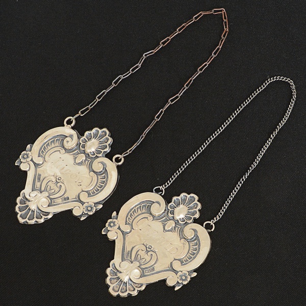 • PRATA, dois (2) identificadores para bebidas com as legendas: LICOR; WHISKY e PORTO, medindo 4,5 x 3 cm mais a corrente (faltando a corrente de um deles), peso total aproximado 17 gr., sinais de uso, vide foto.