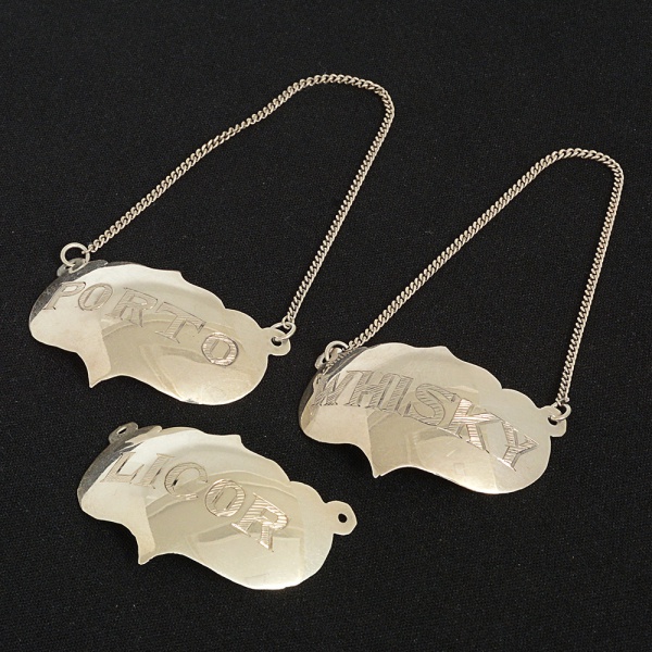 • PRATA, três (3) identificadores para bebidas com as legendas: LICOR; WHISKY e PORTO, medindo 4,5 x 3 cmmais a corrente (faltando a corrente de um deles), peso total aproximado 17 gr., sinais de uso, vide foto.