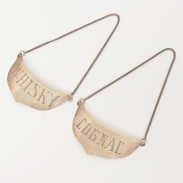 • PRATA, dois (2) identificadores para bebidas com as legendas: WHISKY e COGNAC, contrastados 925 milésimose marca de ourives não identificada, medindo 7 x 3 cm mais a corrente, peso total aproximado 22,5 gr., sinais de uso,vide foto.