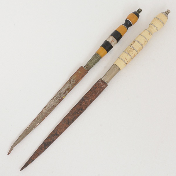• CUTELARIA NORDESTINA, dois (2) punhais com lâminas confeccionadas em aço, sinais de oxidação, ambassem marca de cuteleiro aparente, uma delas com mossas, cabos em osso em uma delas e polímero e/ou chifre em outra,não possuem bainhas, medindo a maior 15,5 cm comprimento, sinais de uso, vide foto.