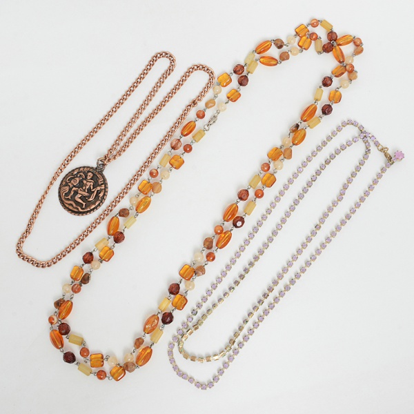 • BIJUTERIAS, três (3) colares distintos, confeccionados em materiais variados, medindo o maior 164 cmcomprimento, sinais de uso, vide foto.