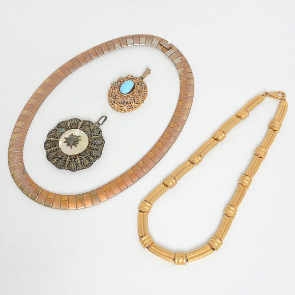 • BIJUTERIAS, quatro (4) itens distintos, confeccionados em materiais variados, sendo: 2 gargantilhas, medindo emmédia 35 cm comprimento; 2 pingentes, medindo o maior 5 cm diâmetro, todos os itens com sinais de uso, vide foto.