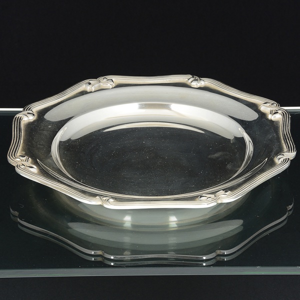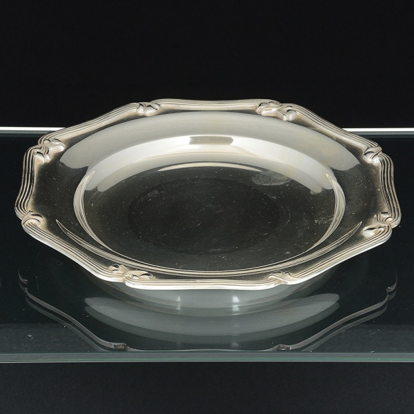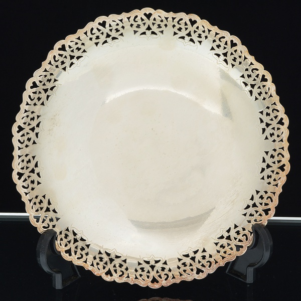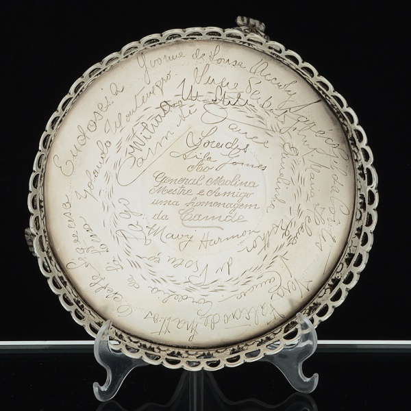 • METAL PRATEADO, uma (1) salva que pertenceu ao militar A. M. Molina (serviu na Força Pública de São Paulono período da Revolução Constitucionalista), com diversas assinaturas, borda vazada em elementos vegetalistas, péscom terminações em garra, medindo 15,5 cm diâmetro, sinais de uso, vide foto.