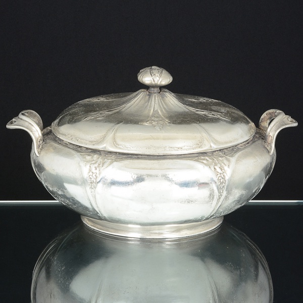 • METAL PRATEADO, uma (1) antiga terrina com tampa, período Art Nouveau, relevada em elementosvegetalistas, marca GALLIA (punção para peças de liga em pewter, usada entre 1900 e 1937 aproximadamente, pelaCHRISTOFLE, fundada em 1830 por Charles Christofle), medindo 24,5 cm diâmetro, sinais de uso, vide foto.