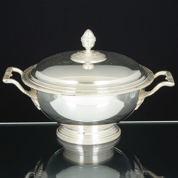 • METAL PRATEADO, uma (1) antiga terrina com tampa, ornamentação no padrão Império Napoleônico, comfrisos intercalados por X e folhas, pega da tampa no formato de pinha, manufatura FRACALANZA (tradição desde1884), medindo 26,5 cm diâmetro mais as alças, sinais de uso, vide foto.