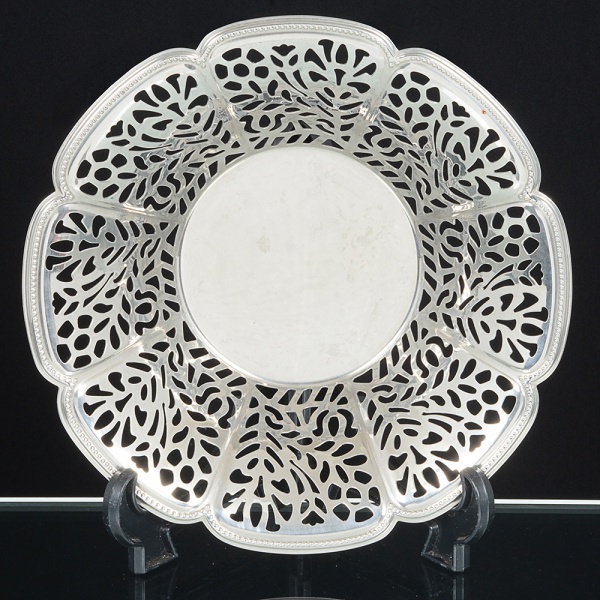 • METAL PRATEADO, uma (1) fruteira com borda recortada e vazada, pés com terminações em volutas,manufatura MERIDIONAL, medindo 20 cm diâmetro, sinais de uso, vide foto.