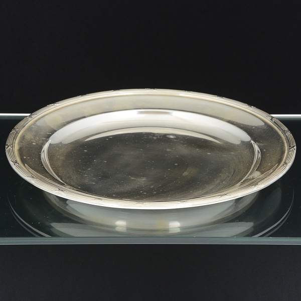 • METAL PRATEADO, uma (1) bandeja circular ornamentação relevada no padrão Império Napoleônico com frisosintercalados por X, manufatura FRACALANZA (tradição desde 1884), medindo 30 cm diâmetro, sinais de uso, videfoto.