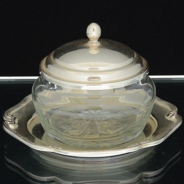• METAL PRATEADO, um (1) açucareiro com tampa e presentoir, recipiente em vidro, incolor e translúcido comfundo estrelado e lapidação dita dedão, presentoir com borda reforçada e relevada em frisos e laçarotes, puncionadoFRACALANZA (tradição desde 1884), medindo a maior peça 14 cm diâmetro, sinais de uso, vide foto.
