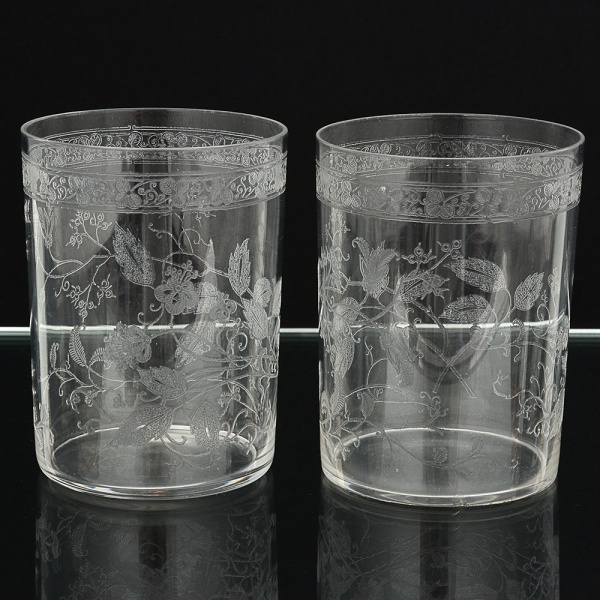 • 142) DEMI CRISTAL, dois (2) copos cilíndricos, incolores e translúcidas, bojo com lapidação vegetalista, manufaturaFRATELLI VITA (fábrica de cristais fundada em 1902, pelos irmãos Giuseppe Vita e Francesco Vita, na cidade deSalvador na Bahia, no início como fábrica de licores, vinhos e refrigerantes, mais tarde com as dificuldades em importaras garrafas devido a Primeira Grande Guerra Mundial, passou a fabricar os próprios engradados, a partir de 1920aventurou-se na produção de cristais recebendo diversas premiações em exposições internacionais, na década de 50 noapogeu da fabrica, financiou o trio elétrico de Dodô e Osmar em 1951 e a candidatura de Martha Rocha para Miss Brasilem 1954, que virou garota propaganda da fabrica, com a transferência da capital do Brasil do Rio de janeiro paraBrasília, a Primeira Dama Sara Kubitschek, encomendou um jogo de taças com o Brasão da república impresso a ouro,a fabrica fechou em 1962), medindo 7 cm diâmetro e 9,5 cm altura, sinais de uso, vide foto.