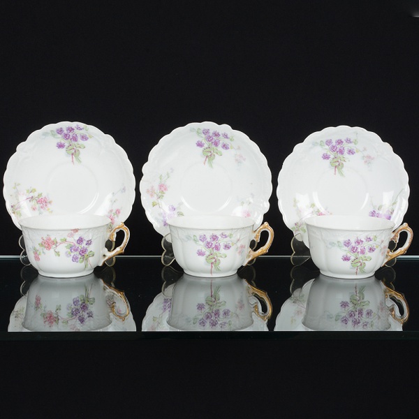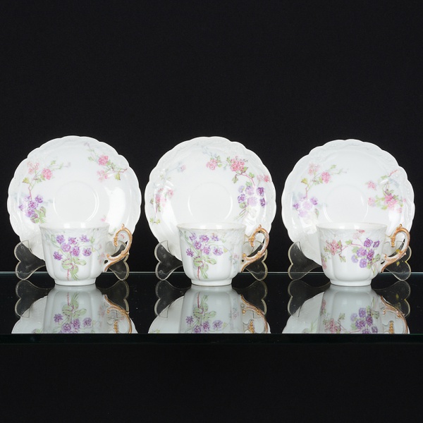 • PORCELANA, três (3) xícaras de chá, ornamentação floral policromada, arremates com frisos a ouro, marcadoLIMOGES PARIS V.S. FRANCE, um pires com trinca na borda, ideais para coleção de cristaleira, vide foto.