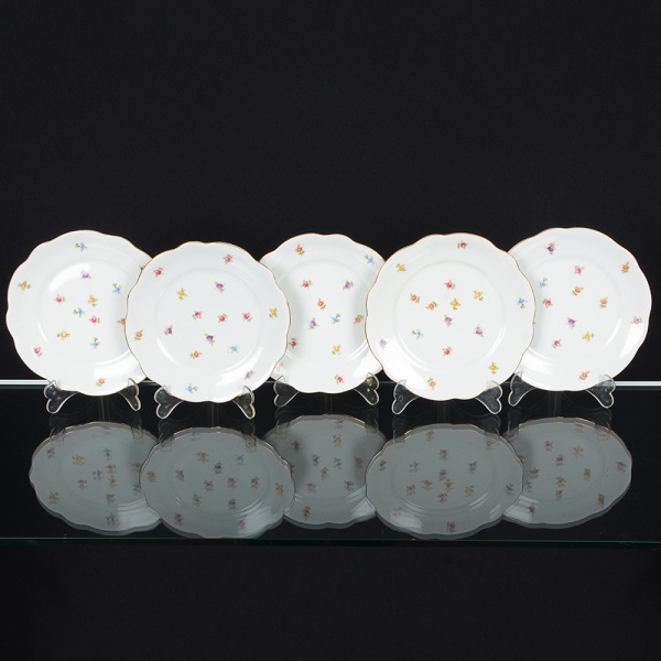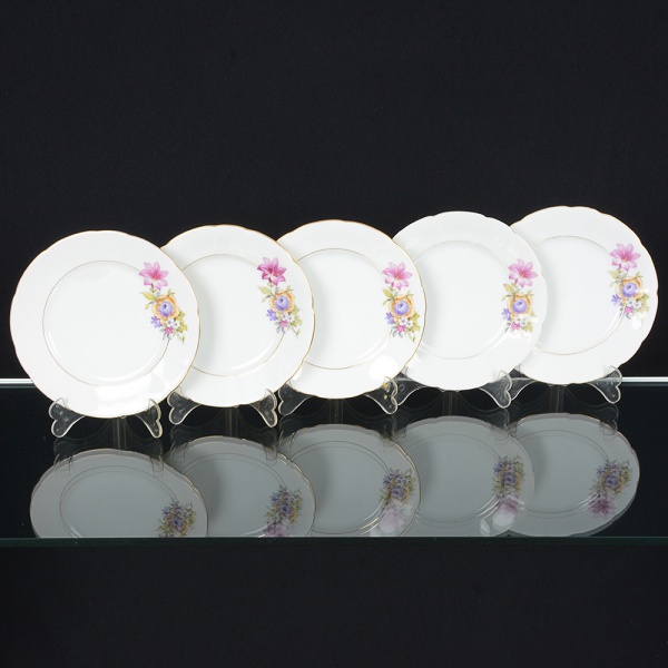 • PORCELANA, cinco (5) pratos para sobremesa, ornamentação floral policromada, borda recortada, frisos a ouro,manufatura RENNER (Porto Alegre, RS, fundada em 1942; em 1998 foi vendida para a Vista Alegre de Portugal; em1999 mudou a razão social para Vista Alegre do Brasil), medindo 17,5 cm diâmetro, sinais de uso, vide foto.