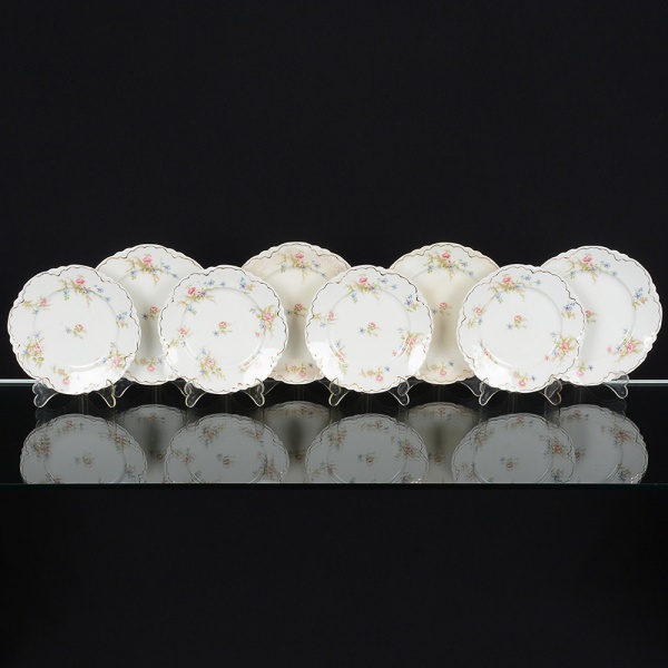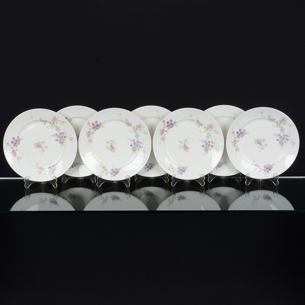 • PORCELANA FRANCESA, sete (7) pratos para sobremesa com ornamentação floral policromada, arremates aouro, , marcado LIMOGES PARIS V.S. FRANCE, medindo 21,5 cm diâmetro, três deles com bicados na borda, videfoto.