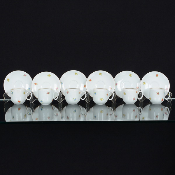 • PORCELANA, seis (6) xícaras para café, ornamentação floral policromada, frisos a ouro, manufatura RENNER(Porto Alegre, RS, fundada em 1942; em 1998 foi vendida para a Vista Alegre de Portugal; em 1999 mudou a razãosocial para Vista Alegre do Brasil), sinais de uso, vide foto.