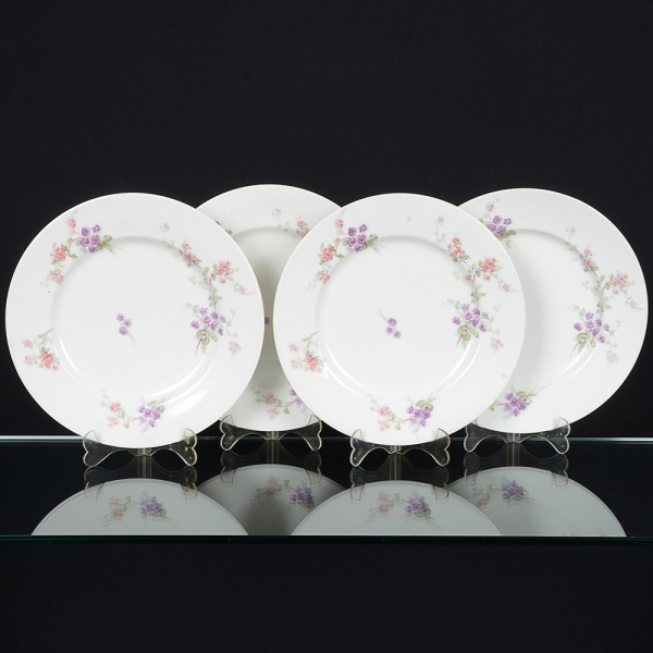 • PORCELANA FRANCESA, quatro (4) pratos rasos com ornamentação floral policromada, arremates a ouro, ,marcado LIMOGES PARIS V.S. FRANCE, medindo 24,5 cm diâmetro, vide foto.