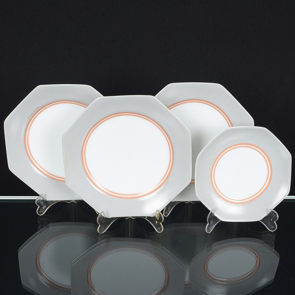 • PORCELANA FRANCESA, quatro (4) itens: 1 pires descasado sem a xícara e 3 pratos octogonais, ornados comfaixas nas tonalidades cinza e marrom, marca DANIEL HECHTER, Paris, medindo respectivamente 15 cm e 20 cmdiâmetro, sinais de uso, vide foto.