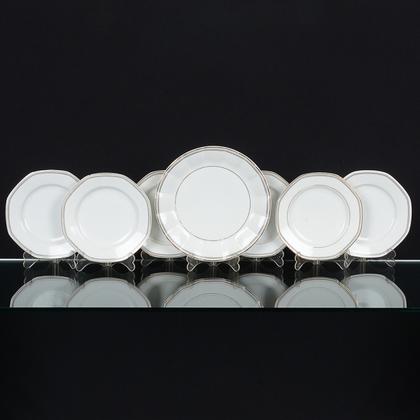 • PORCELANA PORTUGUESA, sete (7) itens: 6 pratos para sobremesa, dois deles bicados na borda, medindo 18cm diâmetro; 1 prato raso, medindo 22,5 cm diâmetro, ornados com faixas nas tonalidades cinza, preto e dourado,manufatura VISTA ALEGRE (fundada em 1824, pelo negociante, lavrador, industrial e político, José Ferreira PintoBasto, através de alvará concedido por D. João VI, tendo seu fundador associado a fábrica os seus 15 filhos, ficando asociedade denominada Ferreira Pinto & Filhos; cinco anos mais tarde recebe o título real pelo reconhecimento de suaarte e sucesso, ficando conhecida como Real Fábrica da Vista Alegre, começou no fabrico de vidros enquanto seempenhava em esforços para a produção de porcelana, os primeiros ensaios conseguidos foram imperfeitos denominadoloiça de pó de pedra, através de boas relações com a fábrica francesa de Sevres conseguiu as receitas para o fabrico deporcelana, somente em 1832, por sorte, é encontrado um jazigo de caulim situado em Aveiro, próximo a Ílhavo, a partirdesta data o fabrico de porcelana foi se aperfeiçoando em Portugal, 1851 expôs com sucesso no Palácio de Cristal emLondres; 1852 D. Fernando II visita a fábrica e encomenda uma baixela completa; 1867 recebeu sua primeira premiaçãona Exposição Universal de Paris; 1880 interrompe a produção de vidros para se dedicar exclusivamente a porcelana;1964 inauguração do Museu Histórico da Vista Alegre; ainda em funcionamento), vide foto.