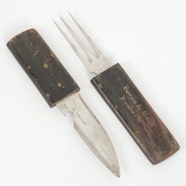• CUTELARIA, um (1) conjunto de bolso, composto de garfo e faca, confecção artesanal em aço, cabo em madeira,marcado GR INOX ARAGUARI MG, propaganda da Barraca de Goias, Brasília, 1972, medindo fechado 17 cmcomprimento, sinais de uso, pequenos defeitos, vide foto.
