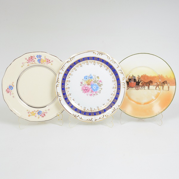 • PORCELANA E FAIANÇA, três (3) pratos decorativos: 1 com ornamentação floral policromada, faixa azulcobalto, arremates a ouro, manufatura SCHMIDT (Pomerode, SC; Mauá, SP; Campo Largo, PR, fundada em 1945,ainda em atividade, maior fábrica de porcelana da América Latina), medindo 18 cm diâmetro; 1 com ornamentaçãofloral policromada, sobre fundo creme, arremates com frisos prateados, manufatura ALFRED MEAKIN (fundada em1875 na região de Tunstall na Inglaterra, de 1897 a 1913 Alfred Meakin Ltd, de 1913 a 1976 Alfred Meakin (Tunstall)Ltd, de 1976 a 1991 Myott Meakin, em 1991 foi vendida para um grupo ligado a uma igreja), modelo MARIGOLDASTORIA SHAPE, medindo 18 cm diâmetro; 1 com ornamentação policromada representando carruagem puxada porduas parelhas de cavalos, manufatura ROYAL DOULTON (fundada em 1815 como JONES, WATTS & DOULTONparceria entre John Doulton, Martha Jones e John Watts em Vauxhall Walk, Lambert, Londres; em 1820 virouDOULTON & WATTS com a saída de Martha Jones; em 1854 virou DOULTON & Co. com a aposentadoria de JohnWatts e a fusão com a HENRY DOULTON & Co.; em 1902 virou ROYAL DOULTON através de concessão real; em2009 passou a ser administrada pela Holding WWRD Waterford Crystal, Wedgwood, Royal Doulton; em 2015 foiadquirida pela empresa finlandesa FISKARS CORPORATION), medindo 17 cm diâmetro, todos com sinais de uso,vide foto.