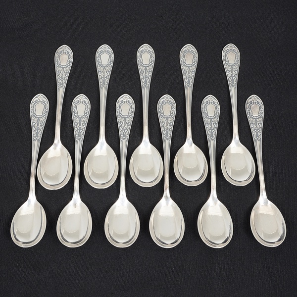 • METAL PRATEADO, onze (11) colheres para sobremesa, extremidade do cabo ornada com escudo e elementosvegetalistas, manufatura EBERLE (Abramo Eberle 1880, Monte Magrè 1945, Caxias do Sul, veio com a primeira levade imigrantes italianos para o Brasil em 1884 junto com seus pais Giuzeppe Eberle e Luigia Zanrosso, seu pai abriu umapequena funilaria mas como tinha que trabalhar na lavoura quem cuidava era a mãe e o pequeno Abramo ajudava nafunilaria; em 1896 quando o pai resolveu vender a funilaria para concentrar os esforços da família na lavoura Abramo,com 16 anos de idade, se propôs a comprá-la do pai, em 1918 já com o nome Abramo Eberle & Cia iniciou a fabricaçãode talheres e utensílios de mesa, morreu em 1945 com 65 anos de idade e os filhos deram continuidade aos negócios até1984 quando venderam para o Grupo Zivi), medindo 14,5 cm, todas com sinais de uso, vide foto.