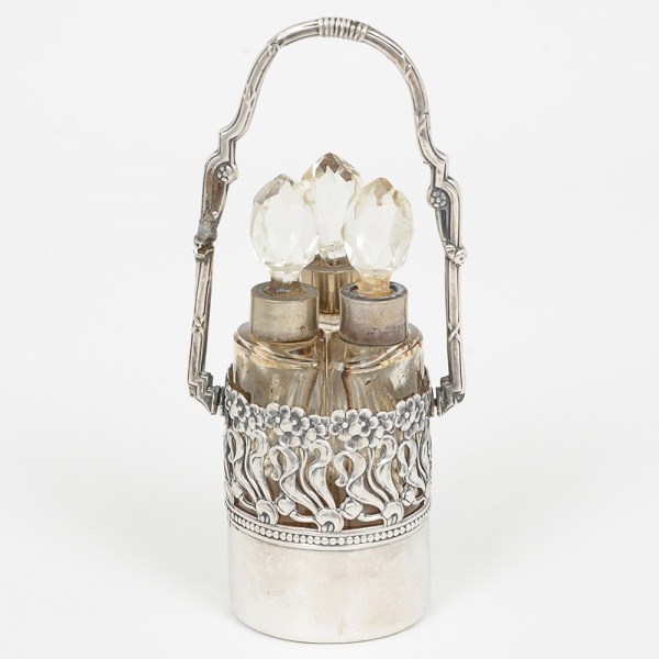 • PRATA ALEMÃ, uma (1) pequena cesta com alça vazada em elementos vegetalistas, puncionada: 800 (teor emmilésimos); coroa e a lua (marca nacional que substituiu as marcas individuais das cidades alemãs, Lei Federal de 16 deJulho 1884, usada a partir de 1886, tornou-se obrigatória em 1 Janeiro de 1888); marca de ourives parcialmente legívelnão identificada, peso somente da prata 32 gr., acompanham 3 frascos acoplados, incolores e translúcidos, tampasfacetadas, altura total até a alça 12 cm altura, sinais de uso, vide foto.
