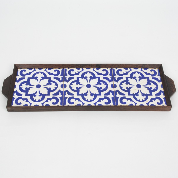 • DIVERSOS, uma (1) bandeja retangular com três azulejos, tonalidades azul e branca, moldura em jacaranda,medindo 46,5 x 16 cm mais as alças, sinais de uso, vide foto.