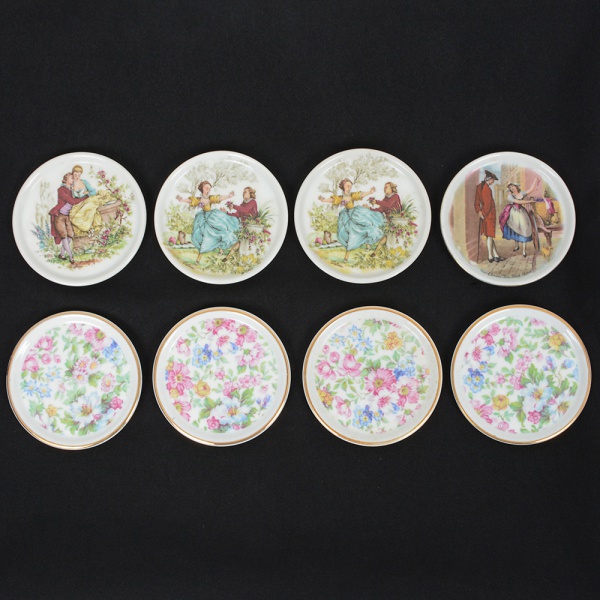 • PORCELANA, oito (8) porta copos policromados: 4 com ornamentação floral, sem marca de manufatura aparente;4 com cenas de galanteio, marca EMANO (Janowitzer, Rio de Janeiro, RJ, 1931 a 1977, revendedor e decorador deporcelana de outras fábricas), todos com arremates em frisos dourados, medindo 8,5 cm diâmetro, sinais de uso, videfoto.