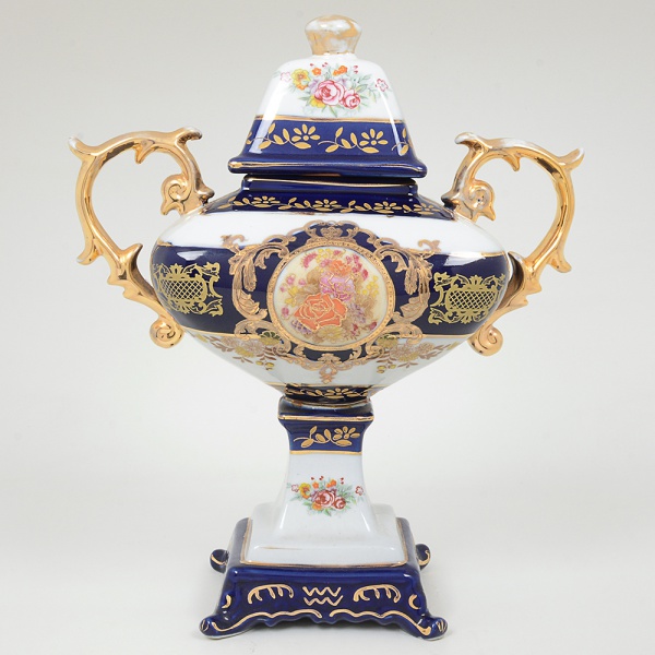 • PORCELANA FRANCESA, um (1) imponente vaso com tampa, ornamentação pintada a mão com florais empolicromia, detalhes em azul cobalto, generosos arremates a ouro, marca de origem FRANCE, selo do importadorVacheron do Brasil, medindo 32 cm altura, desgastes na douração das alças, sinais de uso, vide foto.