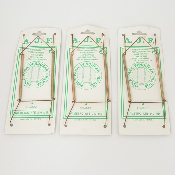 • DIVERSOS, três (3) suportes metálicos para pendurar pratos ou travessas, confeccionado em aramado vergado emolas, fabricado em Portugal, marca A.J.F., tamanho 3 (grande), sem uso, vide foto.