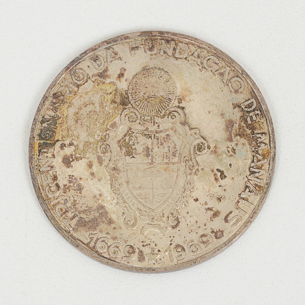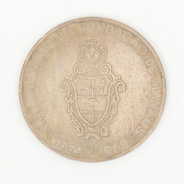 • NUMISMÁTICA, uma (1) medalha confeccionada em PRATA, comemorativa ao Tricentenário da Fundação deManaus, 1669 a 1969, fundador Francisco da Mota Falcão, Prefeito Paulo Pinto Nery, Governador Danilo Duarte deMattos Areosa; gravador G. Carnelosso, medindo 36 mm, peso 12,8 gr., vide foto.