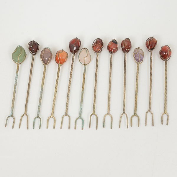 • METAL PRATEADO, onze (11) espetos para petiscos em torçaide, extremidade com pedras semi preciosasvariadas: ametista, ágata, quartzo, etc., medindo aproximadamente 10 cm, todas com sinais de uso, vide foto.