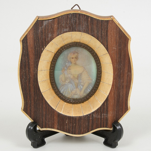 • QUADRINHO, uma (1) miniatura representando dama com trajes antigos, policromada, moldura ovalconfeccionada em madeira e placas de marfinite, medindo 11,5 x 10,5 cm.
