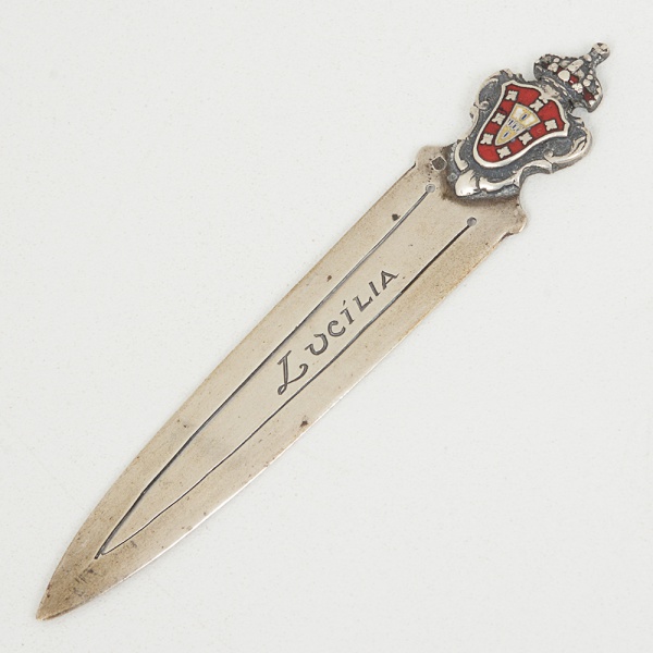 • PRATA PORTUGUESA, um (1) marcador de livros, ornado com brasão de armas português, esmaltado, punções deourives e ensaiador, marca possessória LUCÍLIA, medindo 8 cm comprimento, peso 6,2 gr., sinais de uso, vide foto.