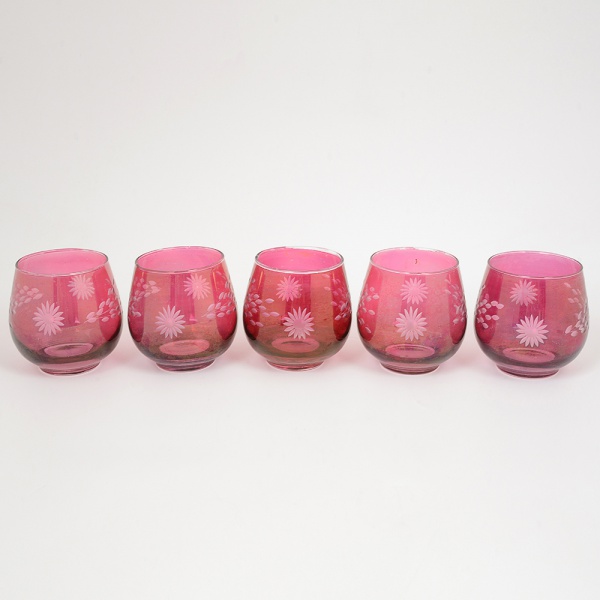 • VIDRO, cinco (5) taças, incolores e translúcidas, pintadas na tonalidade cereja, singela lapidação vegetalista,medindo 9 cm altura, sinais de uso, vide foto.