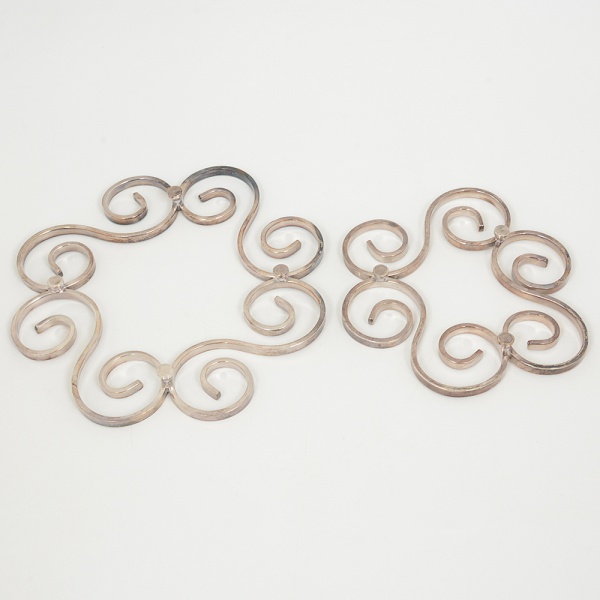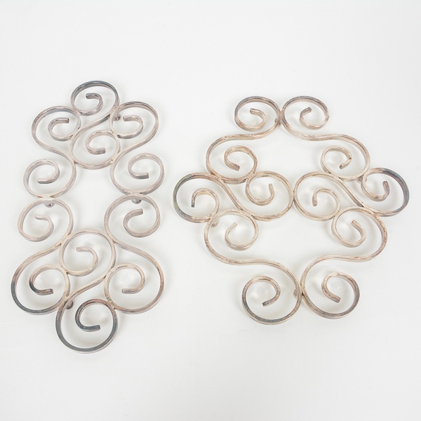 • METAL PRATEADO, dois (2) descansos para panela, confeccionados em metal vergado e soldado, medindo omaior 23,5 cm comprimento, vide foto.